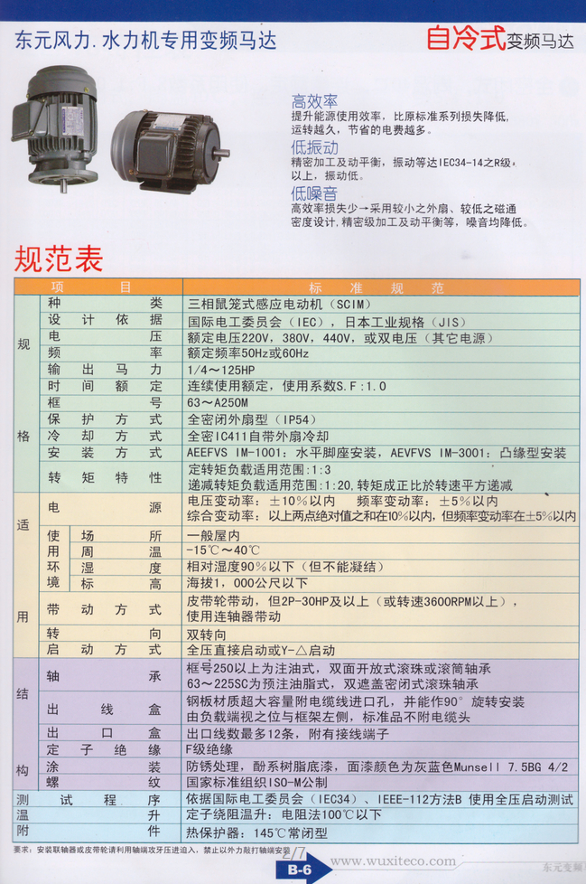 東元變頻電機(jī)種類:三相鼠籠式感應(yīng)電動機(jī) 保護(hù)方式:IP54:全密式 安裝方式:EVEF 水平腳座安裝(IM1001) EVVF 凸托架安裝(IM3001) 極數(shù):4P 6P 8P 額定輸出:1/2-125 1/4-100 25-60 馬達(dá)電源:3#220,380,415,440,460V 50 or 60HZ(其他電源) 時(shí)間額定:連續(xù)額定,使用系數(shù)S.F:1.0 轉(zhuǎn)矩特性:定轉(zhuǎn)矩負(fù)載適用范圍:1:10 遞減轉(zhuǎn)矩負(fù)載適用范圍:1:20,轉(zhuǎn)矩成正比與轉(zhuǎn)平 方遞減 啟動轉(zhuǎn)矩:125%額定轉(zhuǎn)矩 絕緣等級:F級(附熱保護(hù)器---常閉型) |